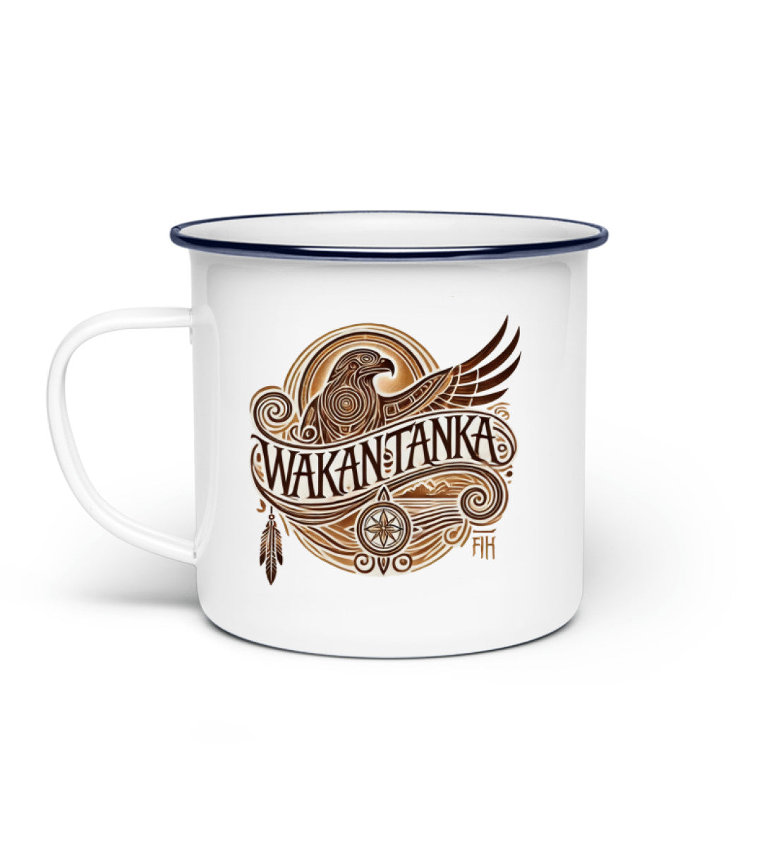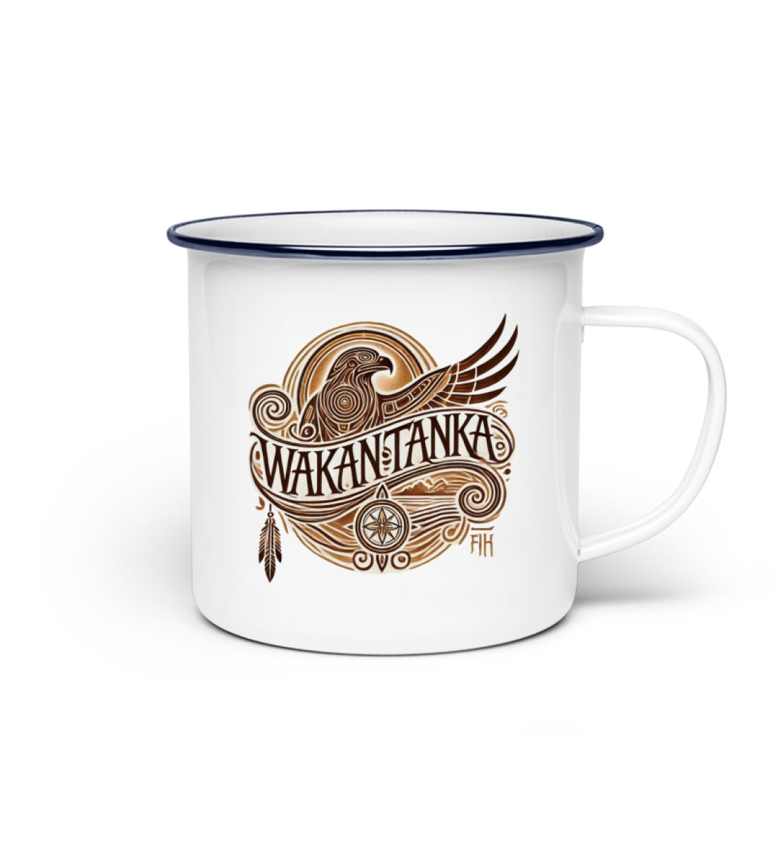 Dieses detailreiche Motiv zeigt den heiligen Adler. Umgeben von Windlinien, Sonne, Stern und Feder fliegt er über ein weites, heiliges Land. Wakan Tanka ist der Begriff der Lakota für den „Großen Geist“, das unsichtbare göttliche Prinzip, das alles durchdringt. Der Adler als Himmelsbote verbindet dich mit dieser spirituellen Kraft - mit Vision, innerer Führung und Freiheit. Ob auf Reisen, am Feuer oder beim Innehalten im Grünen, diese Emaille-Tasse erinnert dich daran, wer du bist: ein Teil des Großen Ganzen.