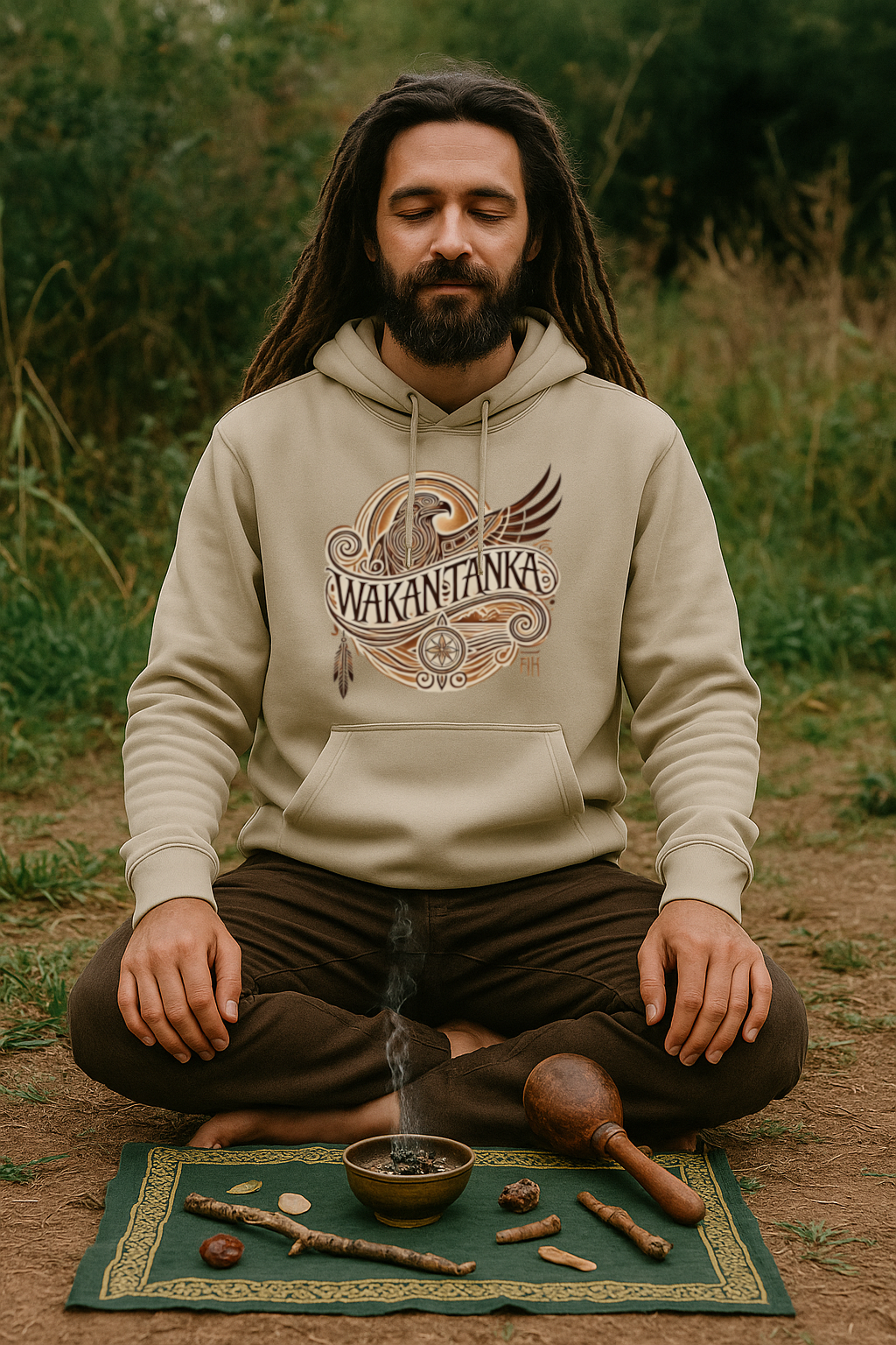 Wakan Tanka ist ein Begriff aus der Sprache der Lakota und steht für das göttliche Mysterium, die Große Heilige Kraft, die alles Leben durchdringt. Sie ist in jedem Atemzug, in jedem Blatt, in jedem Stein - sichtbar und unsichtbar zugleich. Dieses Design erinnert daran, dass das Göttliche nicht fern ist, sondern in allem lebt, was existiert. Ein stilles Symbol für Ehrfurcht, Demut und die heilige Einheit allen Seins.