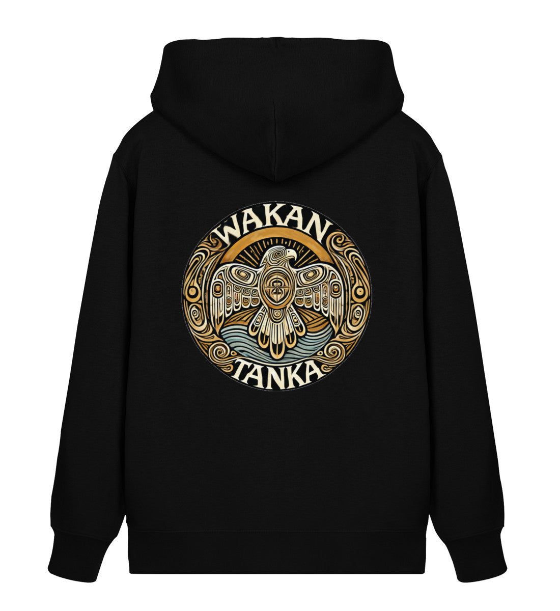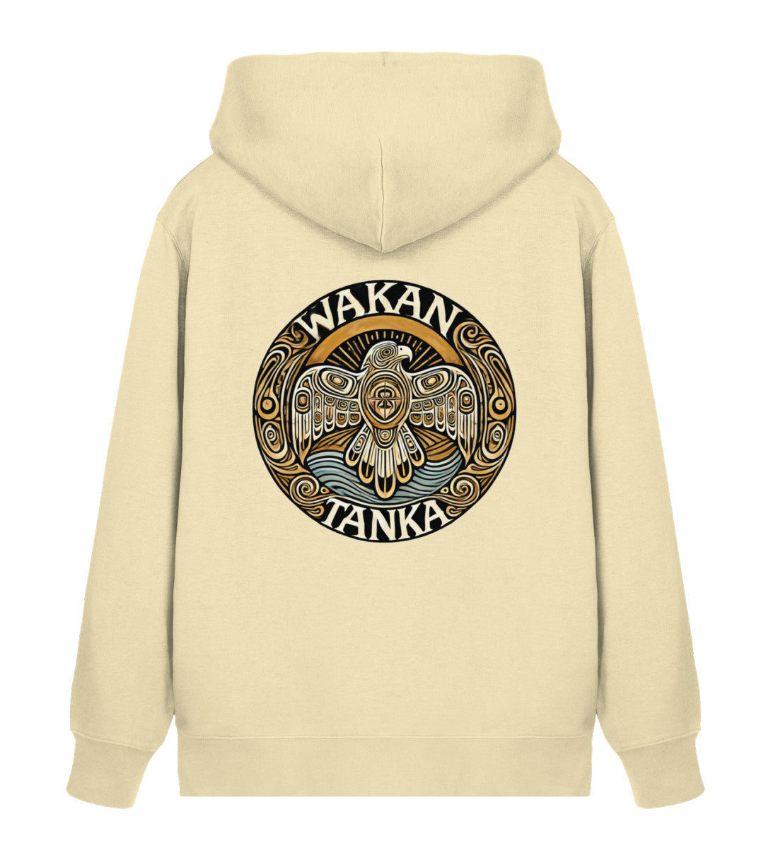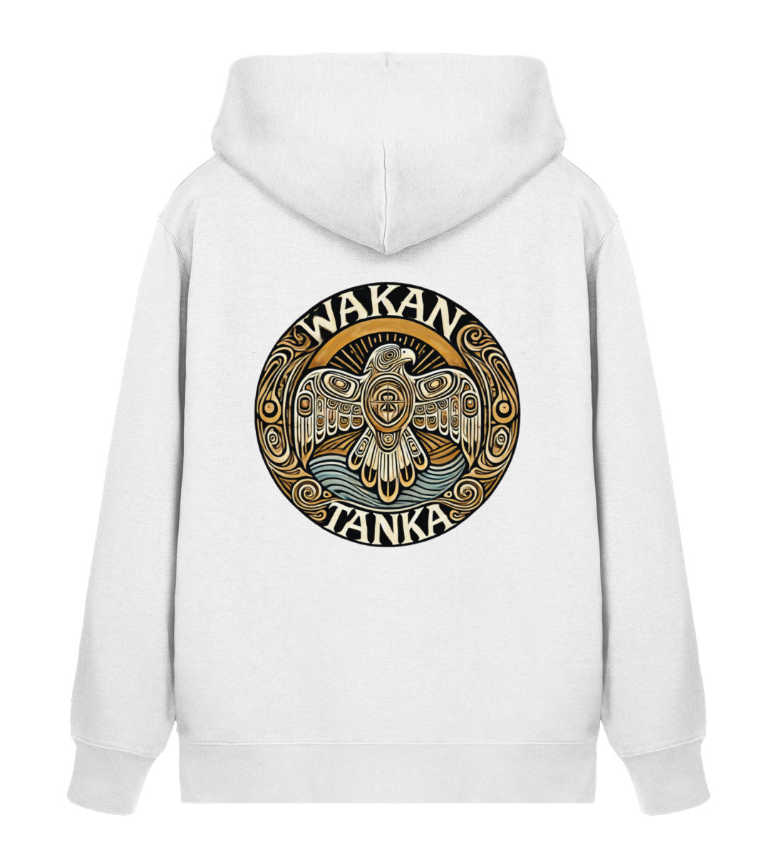 Diese Kapuzenjacke ist mehr als nur ein Kleidungsstück – sie ist eine stille Erinnerung an das Heilige, das alles Leben durchdringt. Wakan Tanka ist ein Ausdruck aus der Sprache der Lakota und bedeutet „Großer Geist“ – der Schöpfer, die Quelle, das Licht, das alles verbindet. Eine Einladung, das Leben in seiner Tiefe wahrzunehmen und in Vertrauen und Achtsamkeit den eigenen Weg zu gehen.