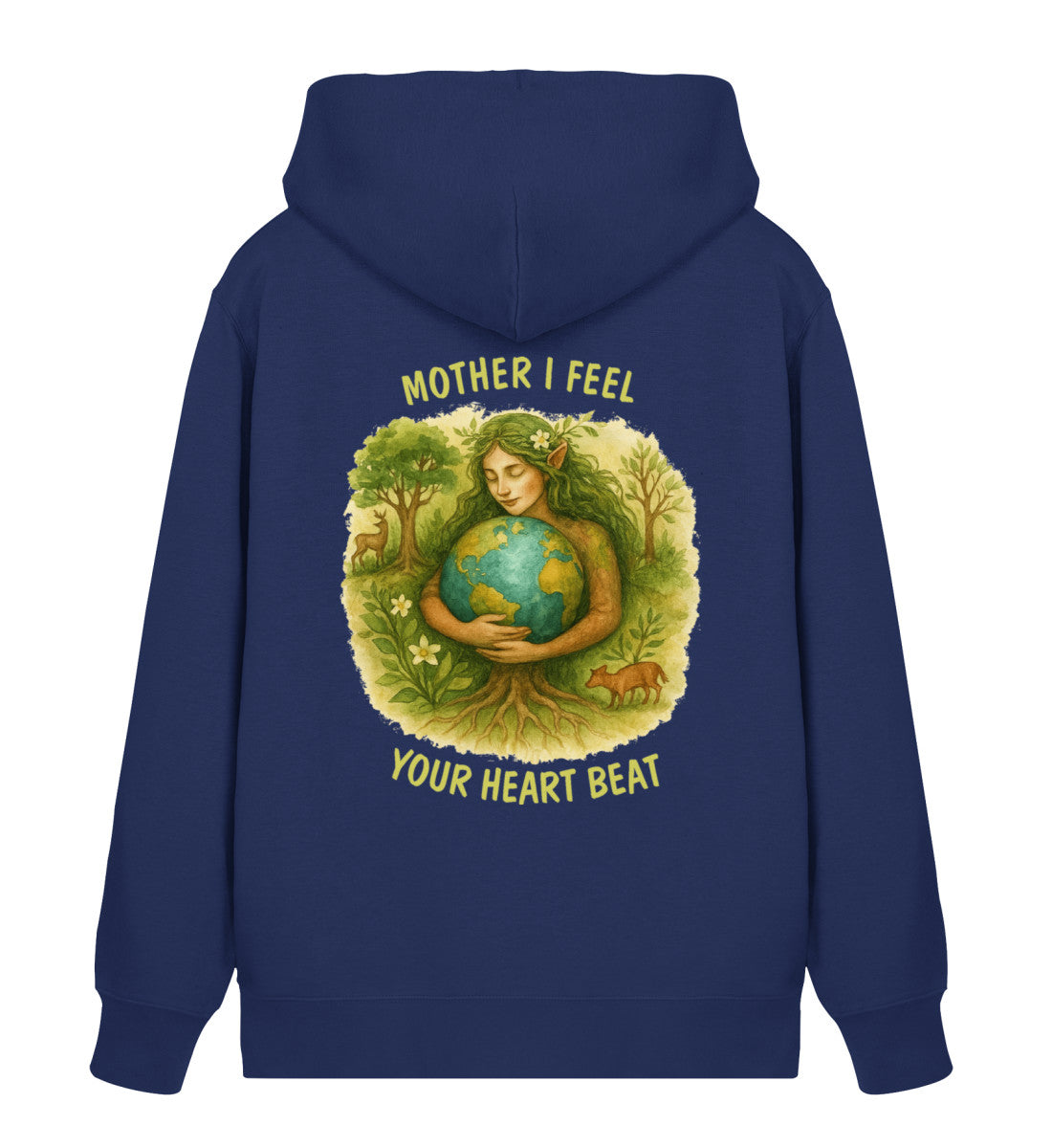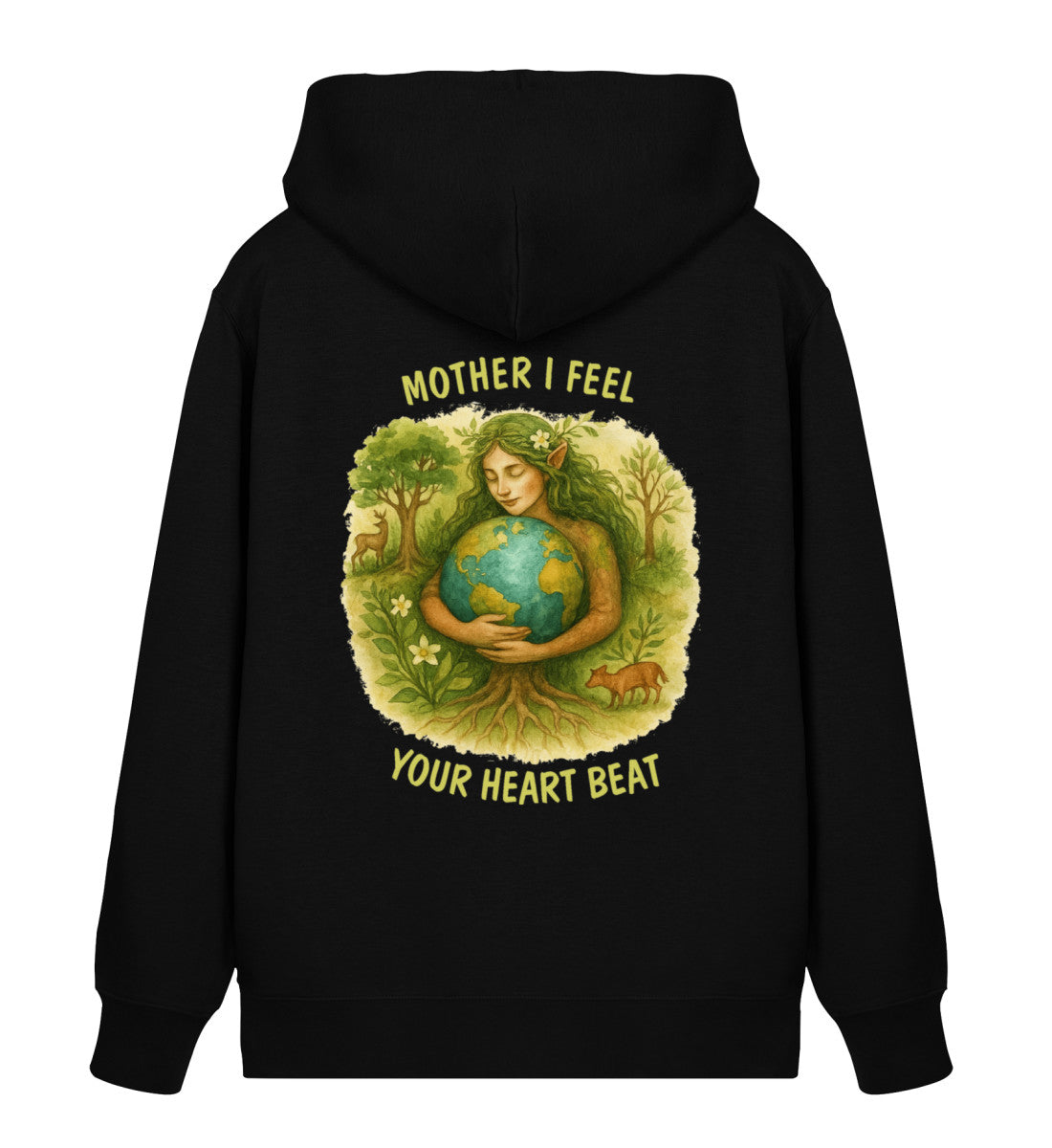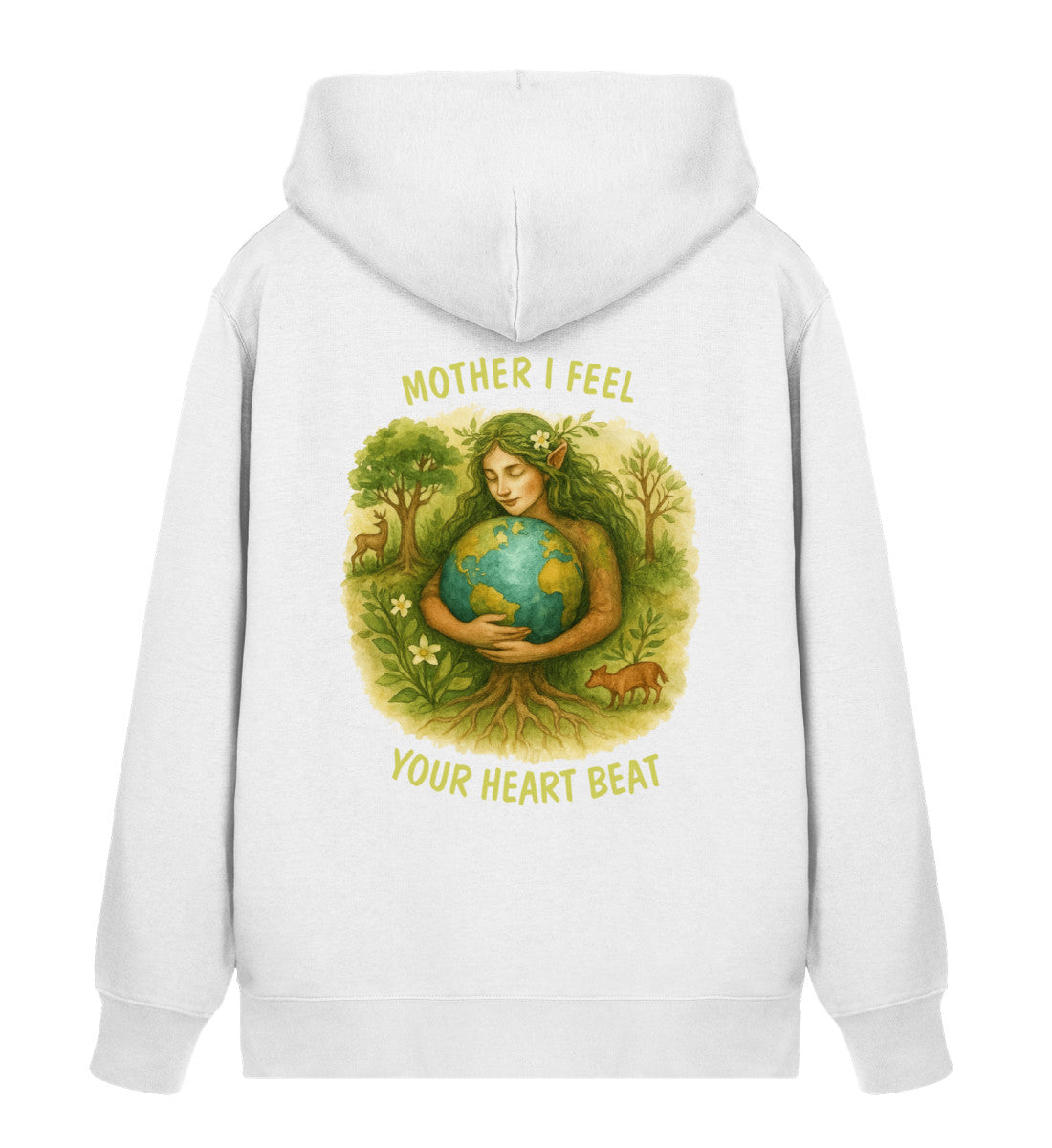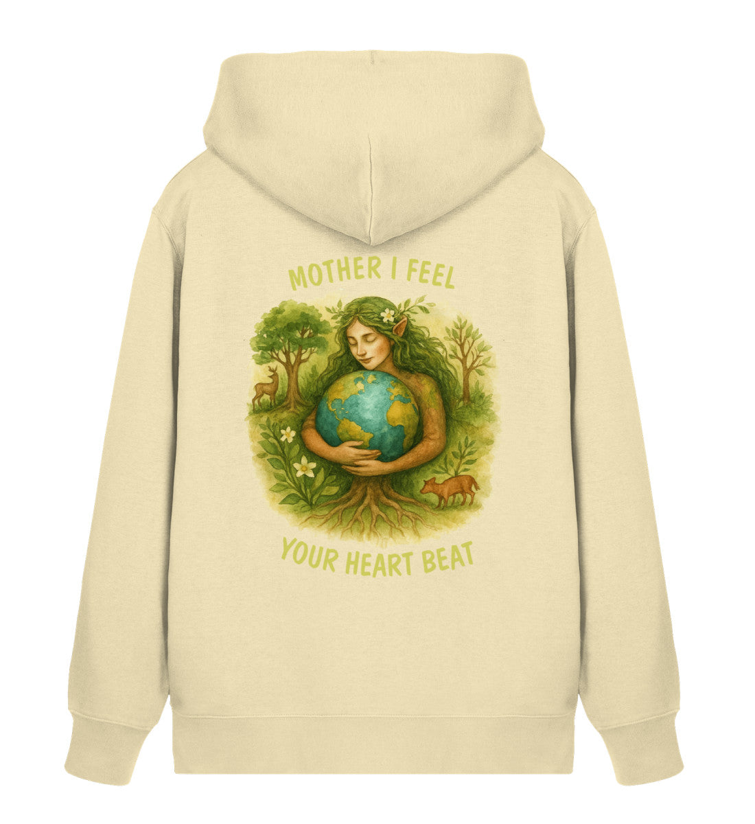 Jede Pray for the Earth Kapuzenjacke wird nachhaltig on-demand in Deutschland veredelt, mit unserem GreenPrint-Verfahren für maximalen Ausdruck bei minimalem Fußabdruck.