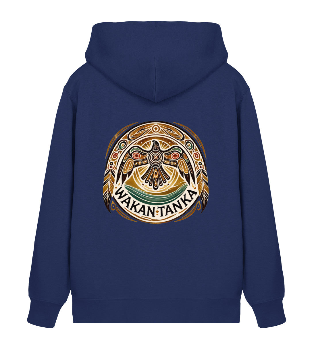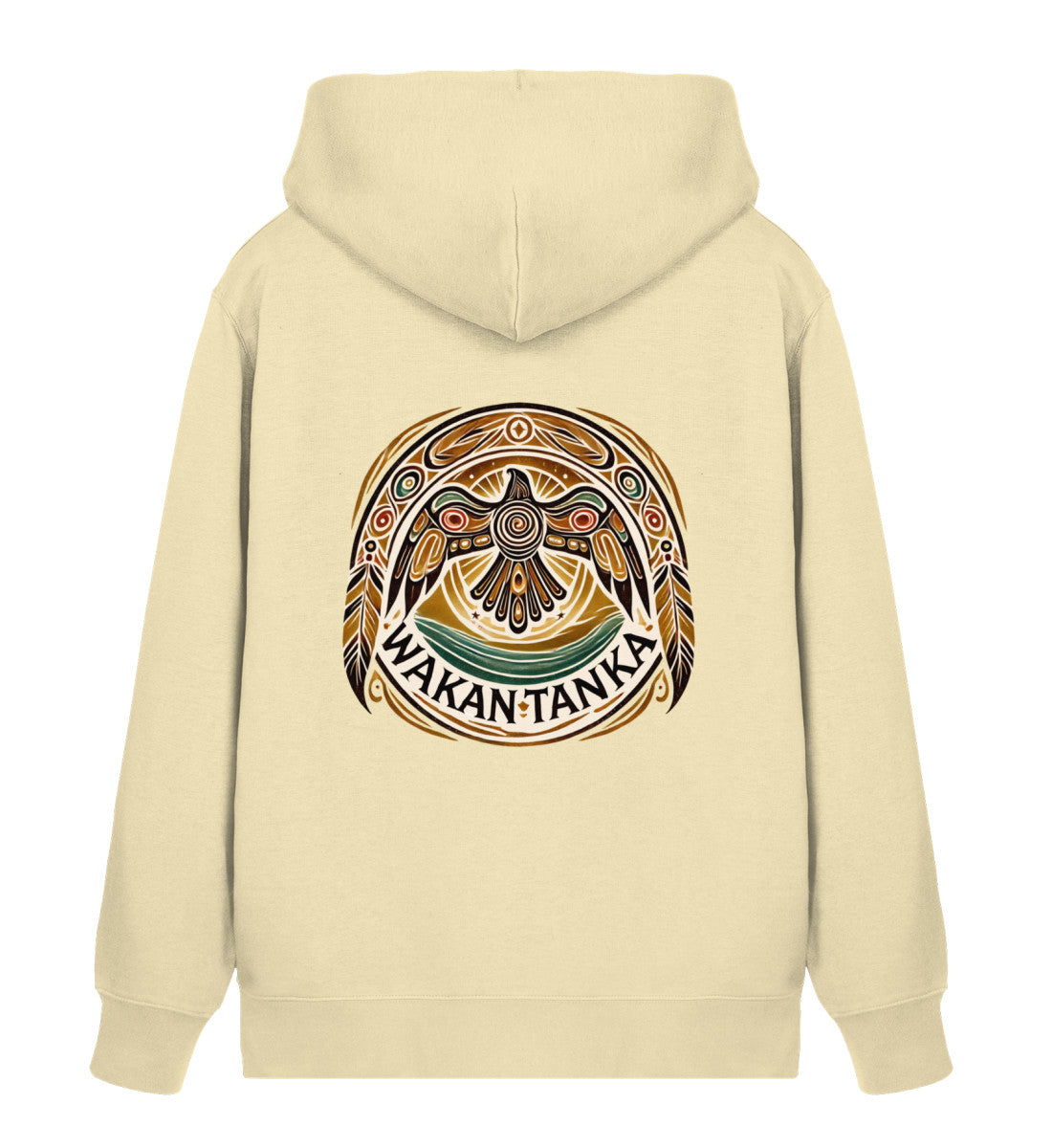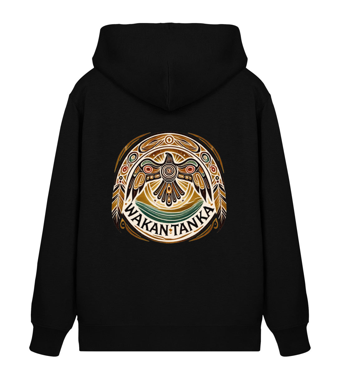 Diese Kapuzenjacke ist mehr als nur ein Kleidungsstück – sie ist eine stille Erinnerung an das Heilige, das alles Leben durchdringt. Wakan Tanka ist ein Ausdruck aus der Sprache der Lakota und bedeutet „Großer Geist“ – der Schöpfer, die Quelle, das Licht, das alles verbindet. Eine Einladung, das Leben in seiner Tiefe wahrzunehmen und in Vertrauen und Achtsamkeit den eigenen Weg zu gehen.