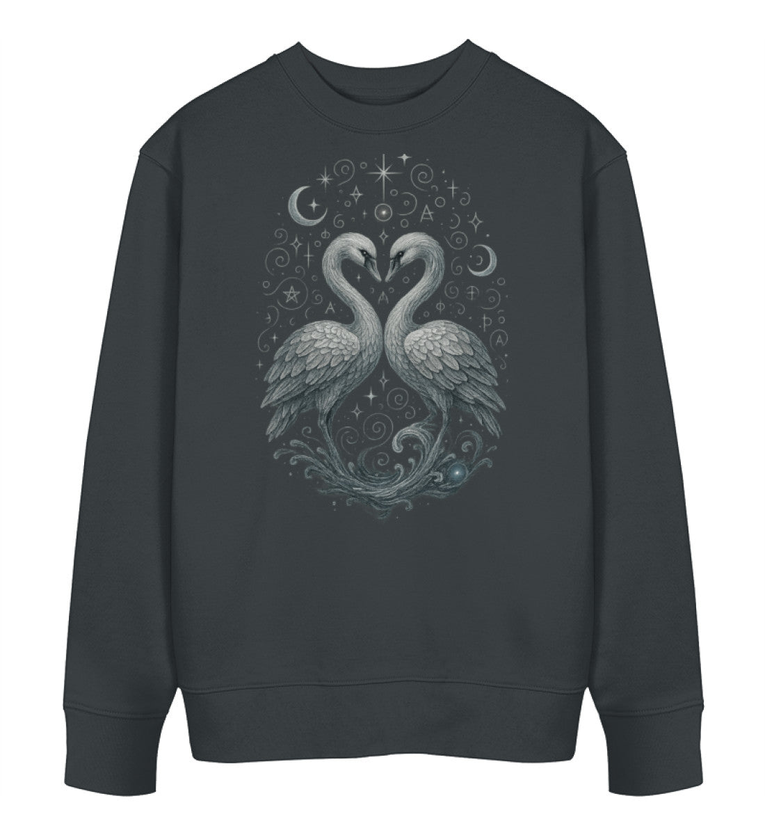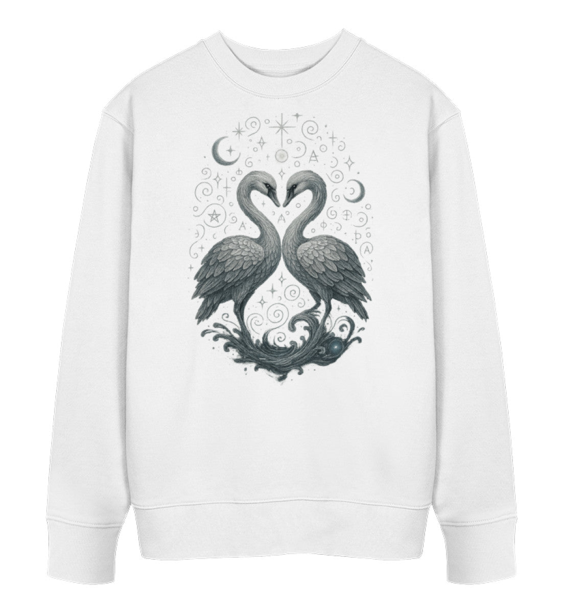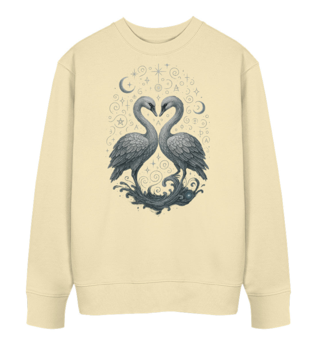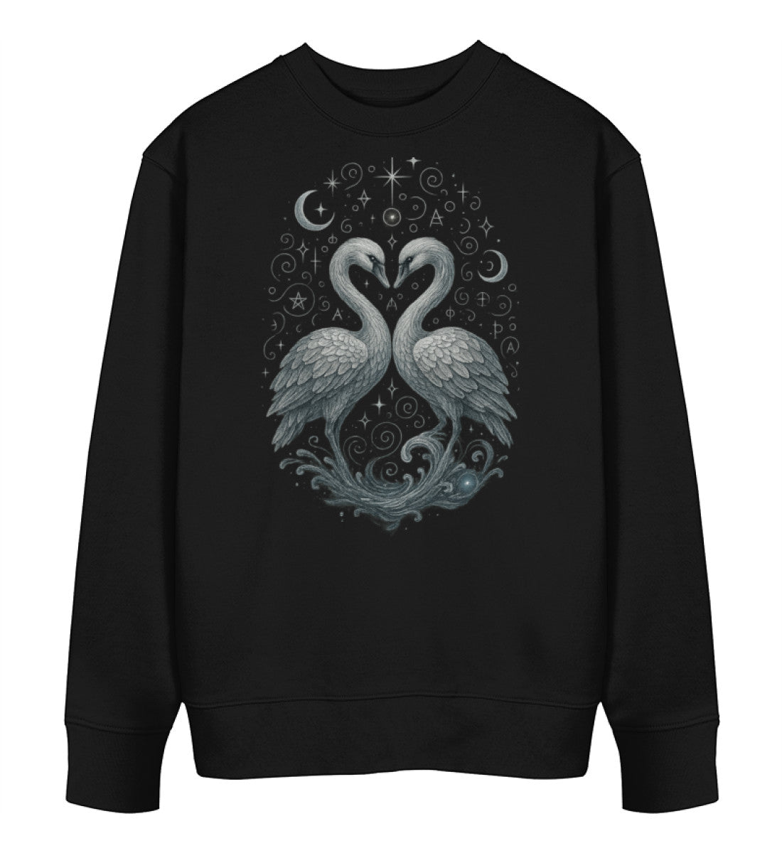 Das Motiv zeigt zwei mystische Schwäne, die sich in vollkommener Harmonie gegenüberstehen. Ihre Hälse formen ein Herz, während sie von Mondsichel, Sternen und Spiralen aus Licht umgeben sind. Ein feines Energiefeld durchzieht das Bild - es öffnet den Raum für Klarheit, Frieden und Liebe in ihrer reinsten Form.