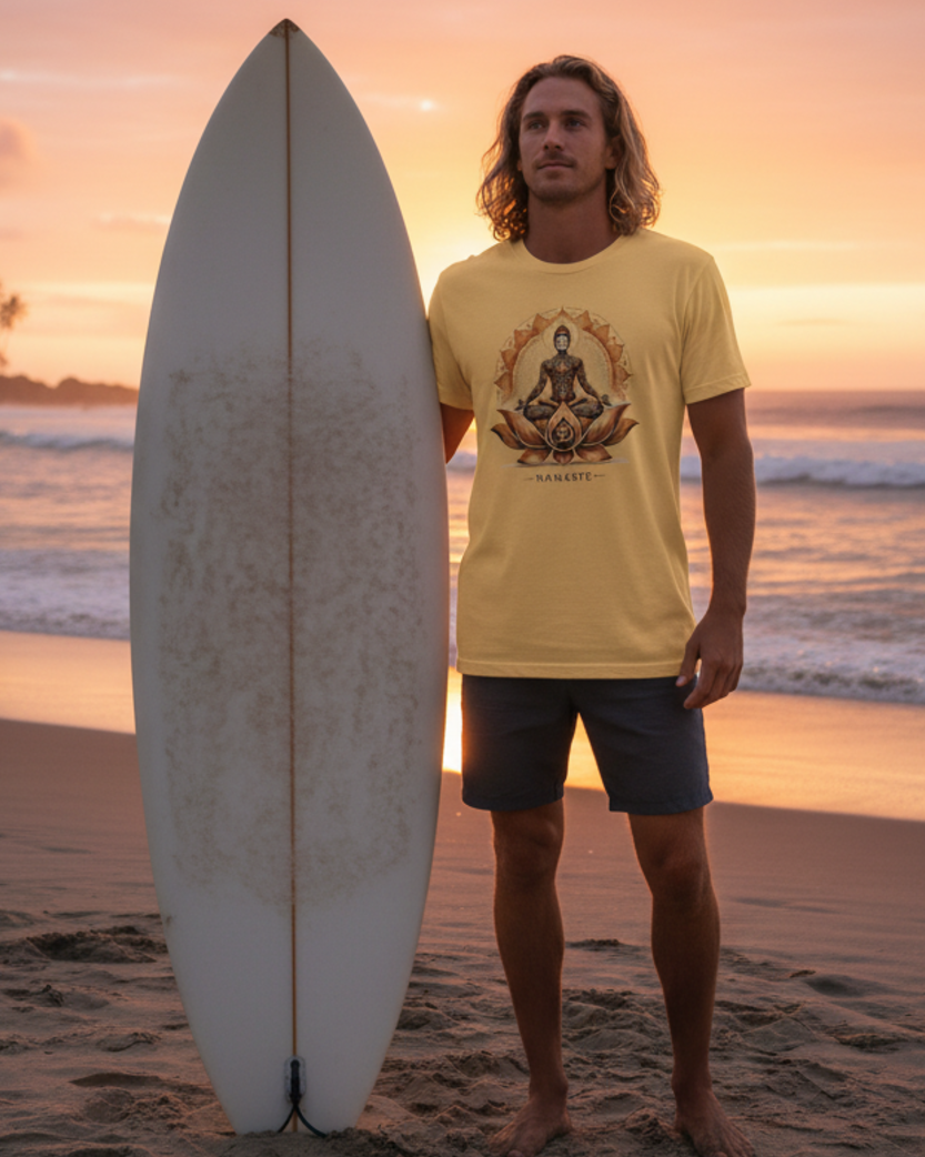 Inmitten einer leuchtenden Lotusblüte sitzt der Yogi - kraftvoll, wach und zugleich vollkommen zentriert. Umgeben von einem Mandala aus Licht und Symbolen verkörpert er die Balance zwischen Stärke und Bewusstsein. Die aufrechte Haltung, das geöffnete Herz und das Om-Zeichen im Zentrum stehen für eine männliche Spiritualität, die aus innerem Frieden erwächst. Für alle, die mit Würde, Klarheit und Fokus ihren Weg gehen.