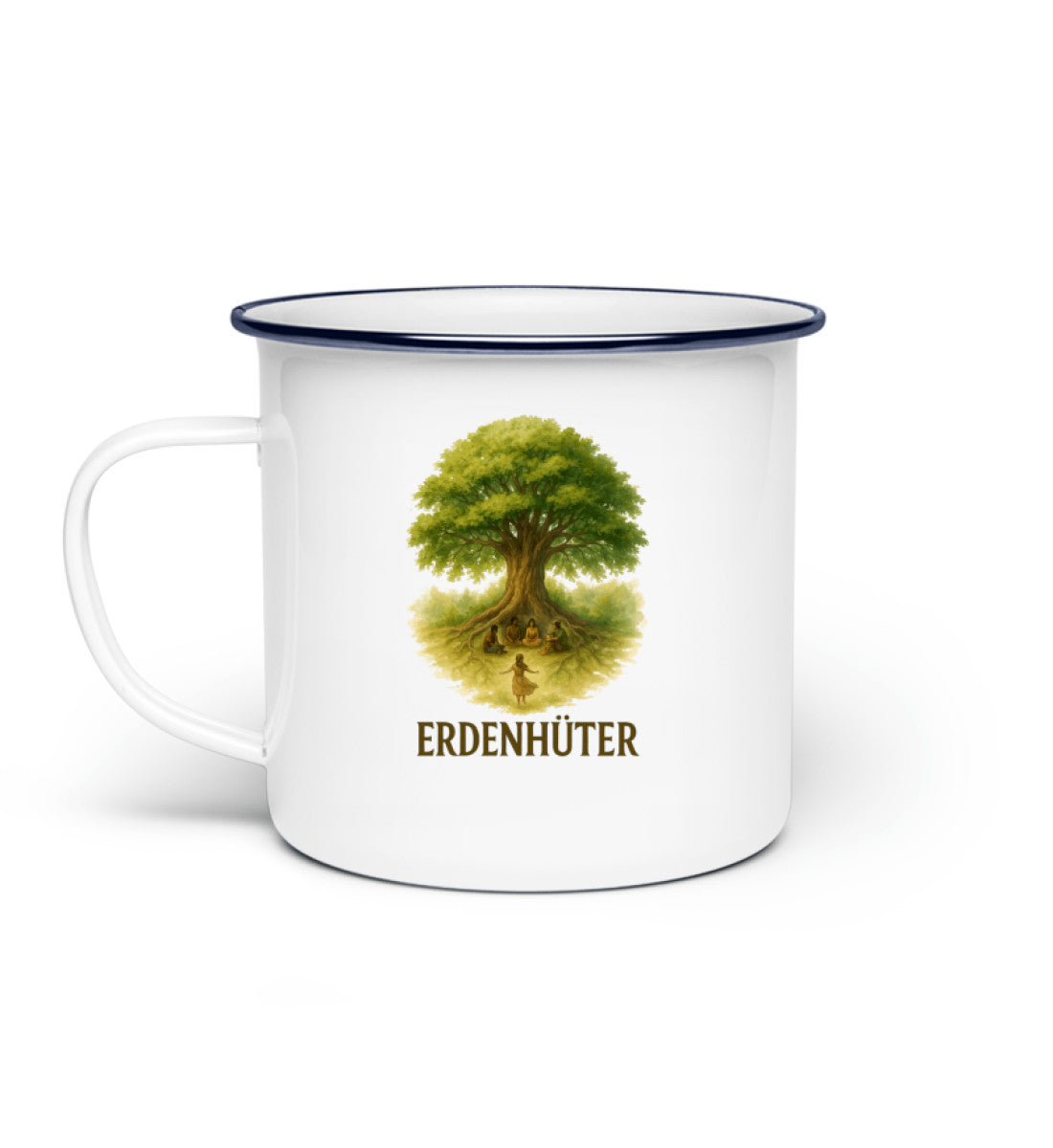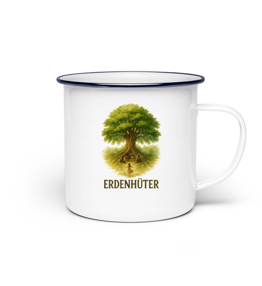 Diese stimmungsvolle Emaille-Tasse zeigt eine kraftvolle Szene unter einer alten, weit ausladenden Baumkrone: Menschen sitzen im Kreis, verwurzelt mit der Erde, im Einklang mit der Natur, verbunden durch Stille, Achtsamkeit und Gemeinschaft. Erdenhüter steht für die Rückverbindung zum Wesentlichen, für Dankbarkeit gegenüber dem Leben und das Bewahren heiliger Kreisläufe.